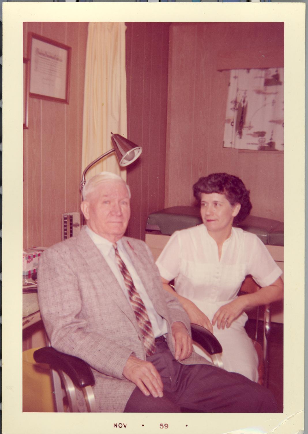 PicId: scan1052 Group: Misc Where: Grand Dad Hershey's Office, Churubusco, IN When: 07-01-1959 Subject(s): Grand Dad Hershey; Doris Johnson Comments: Grand Dad in examining room at his office; w/Doris |