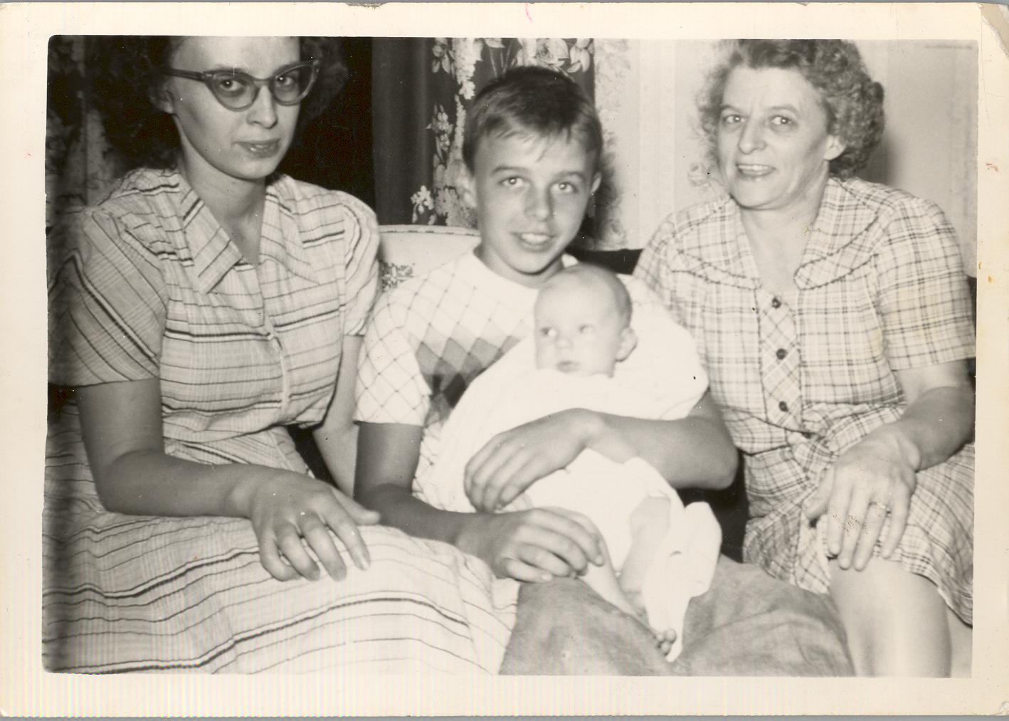 PicId: scan0002 Group: Misc Where: Grandma Polly's House, Churubusco, IN When: 07-15-1949 Subject(s): Kathleen Kay Hershey; Edgar Allen Clingerman, Sr.; Ernest Allen Hershey, III; Pauline Clingerman(Grandma Polly Comments: Edgar’s holding Al; he thought he knew exactly how to take care of him |