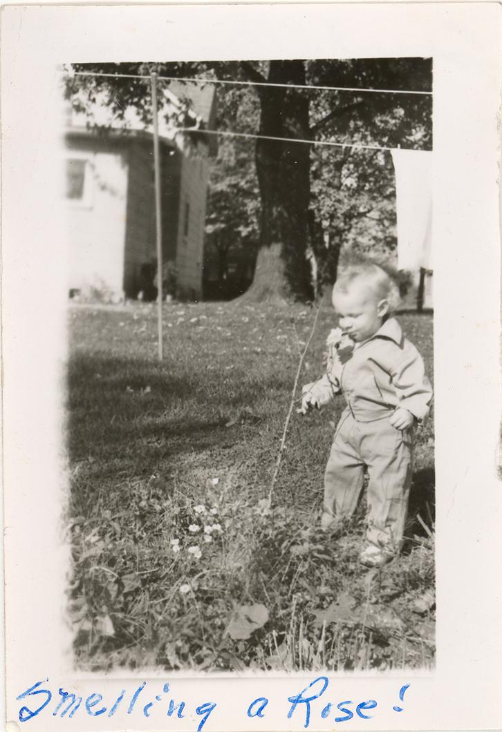 PicId: scan0073a Group: Misc Where: Grandma Polly's House, Churubusco, IN When: 07-01-1950 Subject(s): Ernest Allen Hershey, III Comments: Al smelling rose in Polly’s backyard |