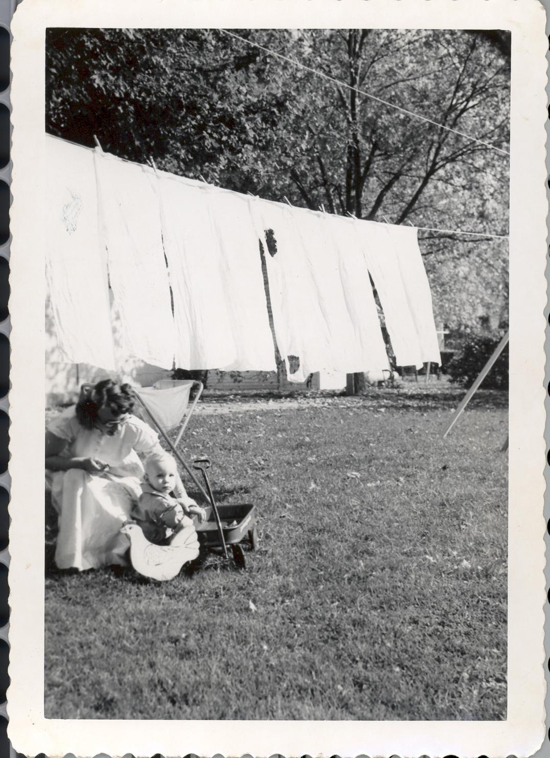 PicId: scan0081 Group: Misc Where: Grandma Polly's House, Churubusco, IN When: 07-01-1950 Subject(s): Kathleen Kay Hershey; Ernest Allen Hershey, III Comments: Mom and Al at Polly’s at Busco (diapers hanging in background); before they drove Grandma Hershey out to CA |