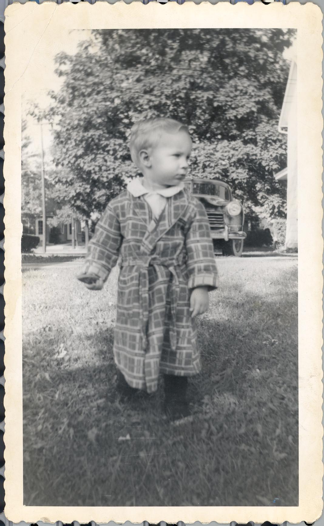 PicId: scan0091 Group: Misc Where: Grandma Polly's House, Churubusco, IN When: 07-01-1951 Subject(s): Ernest Allen Hershey, III Comments: Al at Polly’s at Busco; wearing Prudence’s robe |