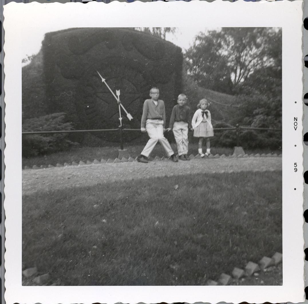 PicId: scan1225 Group: Misc Where: Greenfield Village When: 07-01-1959 Subject(s): Ernest Allen Hershey, III; Stephen Douglas Hershey; Patricia Kay Hershey Comments: In front of clock made out of flowers |