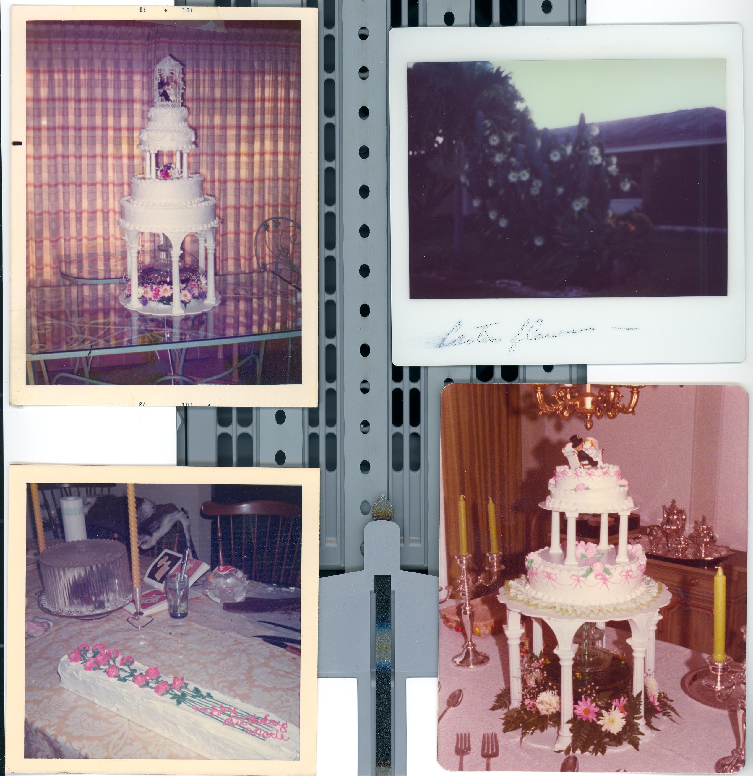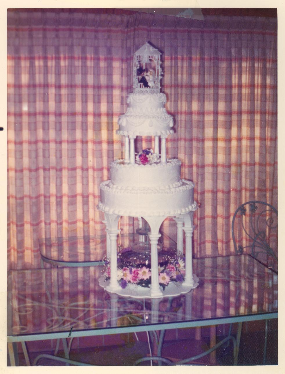 PicId: scan5486a Group: Album, Hersheys 1977-1979 Where: Grosse Pointe When: Unknown Subject(s): Unspecified Comments: Lucy Agnone's wedding cake at Agnone's at reception in their back yard. They lived across the street from us then at 799 Berkshire. |