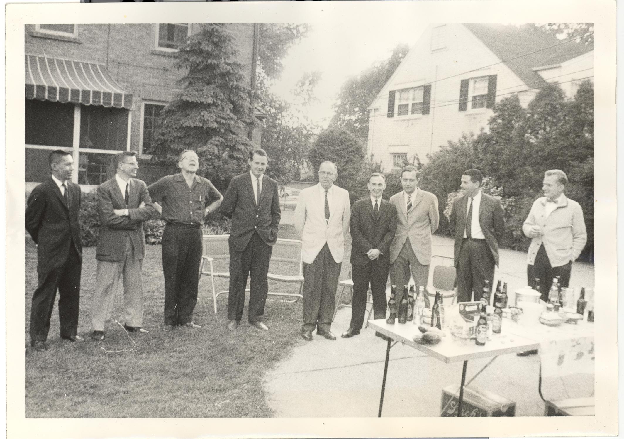 PicId: scan1213 Group: Misc Where: Grosse Pointe City Park When: 07-01-1963 Subject(s): Ernest Allen Hershey, Jr. Comments: Party at Dr. Taber's (on Staff at HFH) of Thoracic Surgery Residents at HFH. Dad is on far right. Dr. Taber is 3rd from left, one right in middle with white jacket was Dr. Lam (Head of Dept of Thoracic Surgery) |