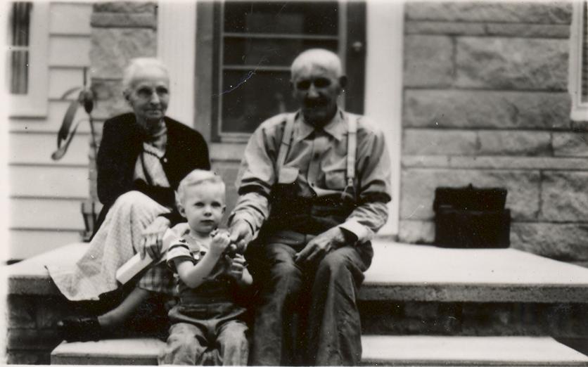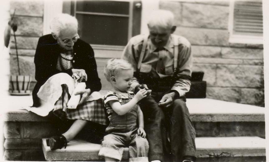 PicId: scan0074b Group: Misc Where: Indiana When: 07-05-1951 Subject(s): Grandma Miller; Ernest Allen Hershey, III; Grandpa Miller Comments: Al w/Grandma & Grandpa Miller at Aunt Florence’s at Lake Webster, IN |