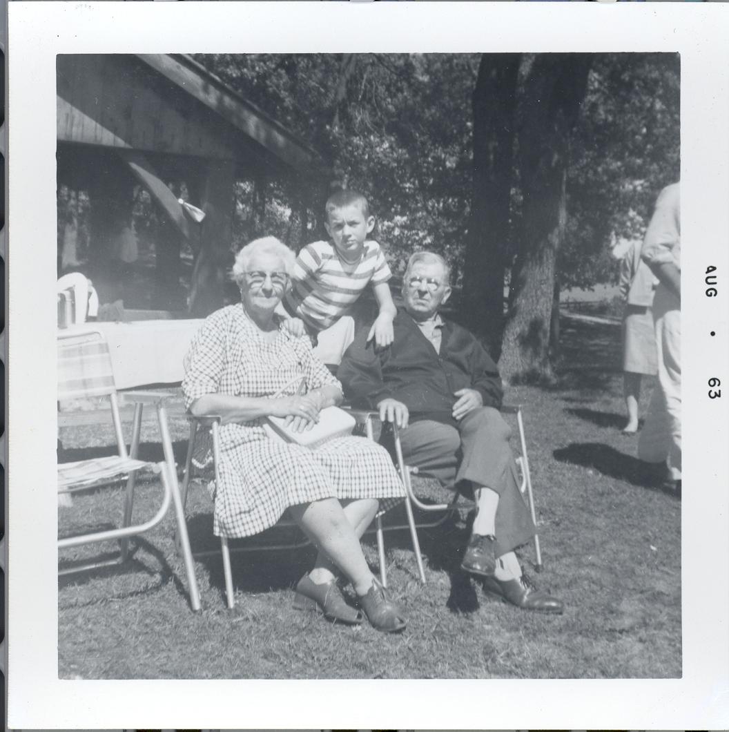 PicId: scan1233 Group: Misc Where: Indiana When: 05-15-1963 Subject(s): Unspecified Comments: At Miller reunion: Aunt Blanche, Jimmy (their grandson), and Uncle Ben Miller (Polly's brother) |