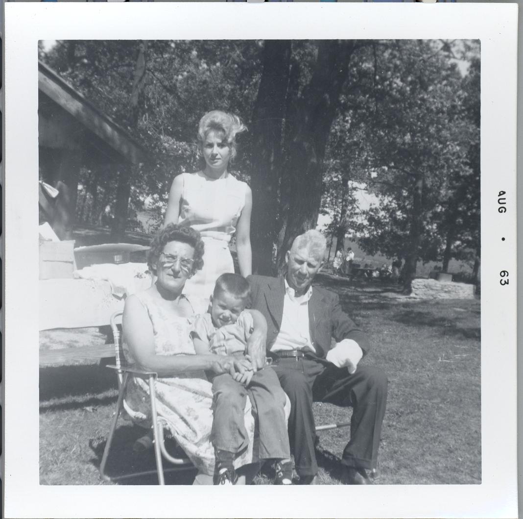 PicId: scan1234 Group: Misc Where: Indiana When: 05-15-1963 Subject(s): Unspecified Comments: Miller reunion: Aunt Minnie and Uncle Otto (Polly's brother) with their daughter in law, Inga, and grandson, Tim. Their only son , Phil, had passed away after auto accident |
