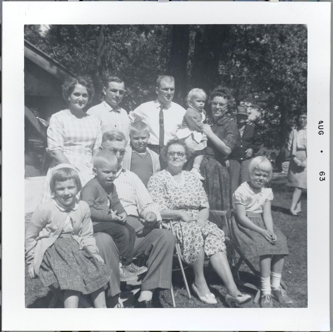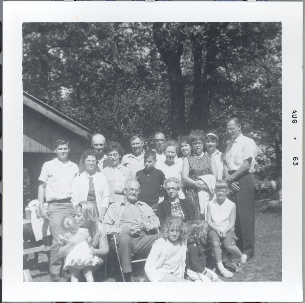 PicId: scan1236 Group: Misc Where: Indiana When: 05-15-1963 Subject(s): Unspecified Comments: Aunt Beulah (Polly's sister) and Uncle Levi Price and children, Thad and Lowell plus spouses and grandchildren--taken at Miller Reunion |
