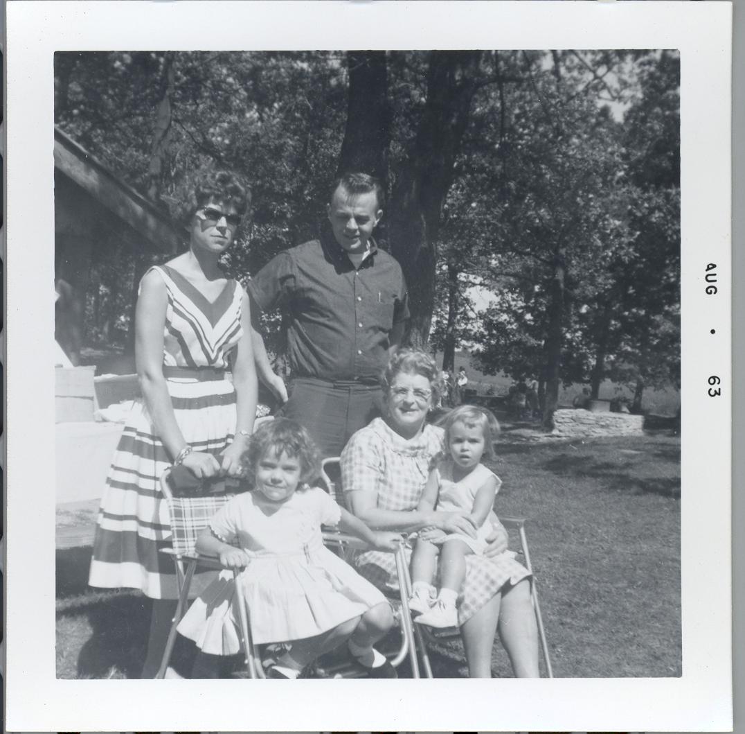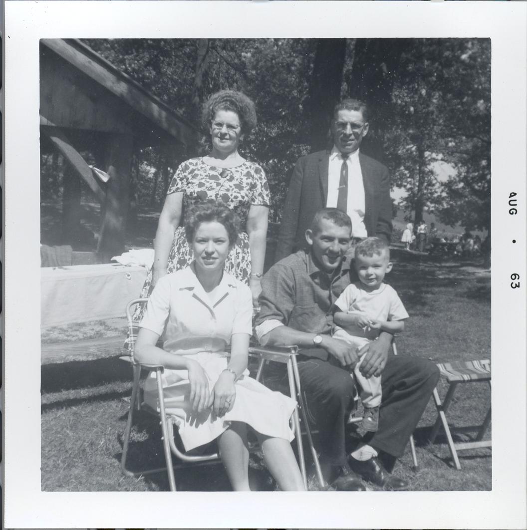 PicId: scan1238 Group: Misc Where: Indiana When: 05-15-1963 Subject(s): Unspecified Comments: Uncle Curt (Polly's brother) and Aunt Mabel and Nancy with spouse and grandchild, Steve Uncle Curt was the one that use to play Doctor with mom and pretend to call up doctor and say her pain was 3rd button on coveralls and pretend doctor would say,"Spit water in her face." This was taken at Miller Reunion |
