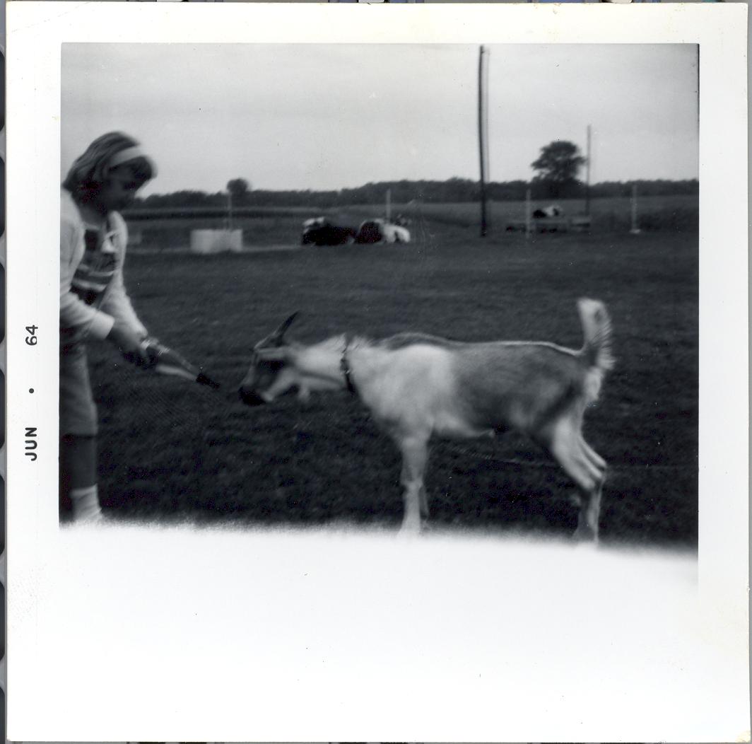PicId: scan1268 Group: Misc Where: Indiana When: 09-15-1963 Subject(s): Patricia Kay Hershey Comments: Pat feeding goat at Aunt Louise's and Uncle Donald Gerdes' farm |