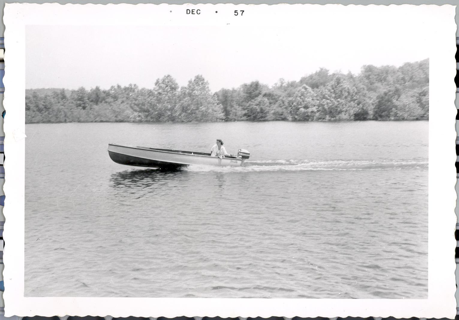 PicId: scan0165 Group: Trip, The Ozarks Where: Lake Norfork, The Ozarks, AK When: 08-15-1957 Subject(s): Kathleen Kay Hershey Comments: Wild woman Mom on boat on Lake Norfork; on vacation in Ozarks |