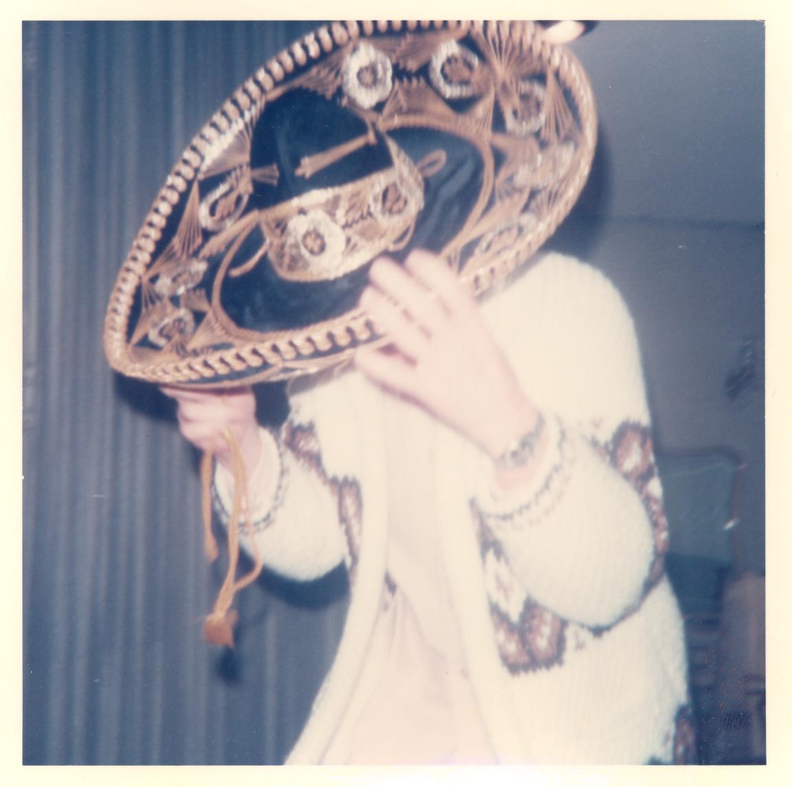 PicId: scan4264 Group: Album, Mexico Trip 1974 Where: Mexico City, Mexico When: 02-24-1974 Subject(s): Kathleen Kay Hershey Comments: Dad donning the sombrero and sweater he bargained for at the open air market |