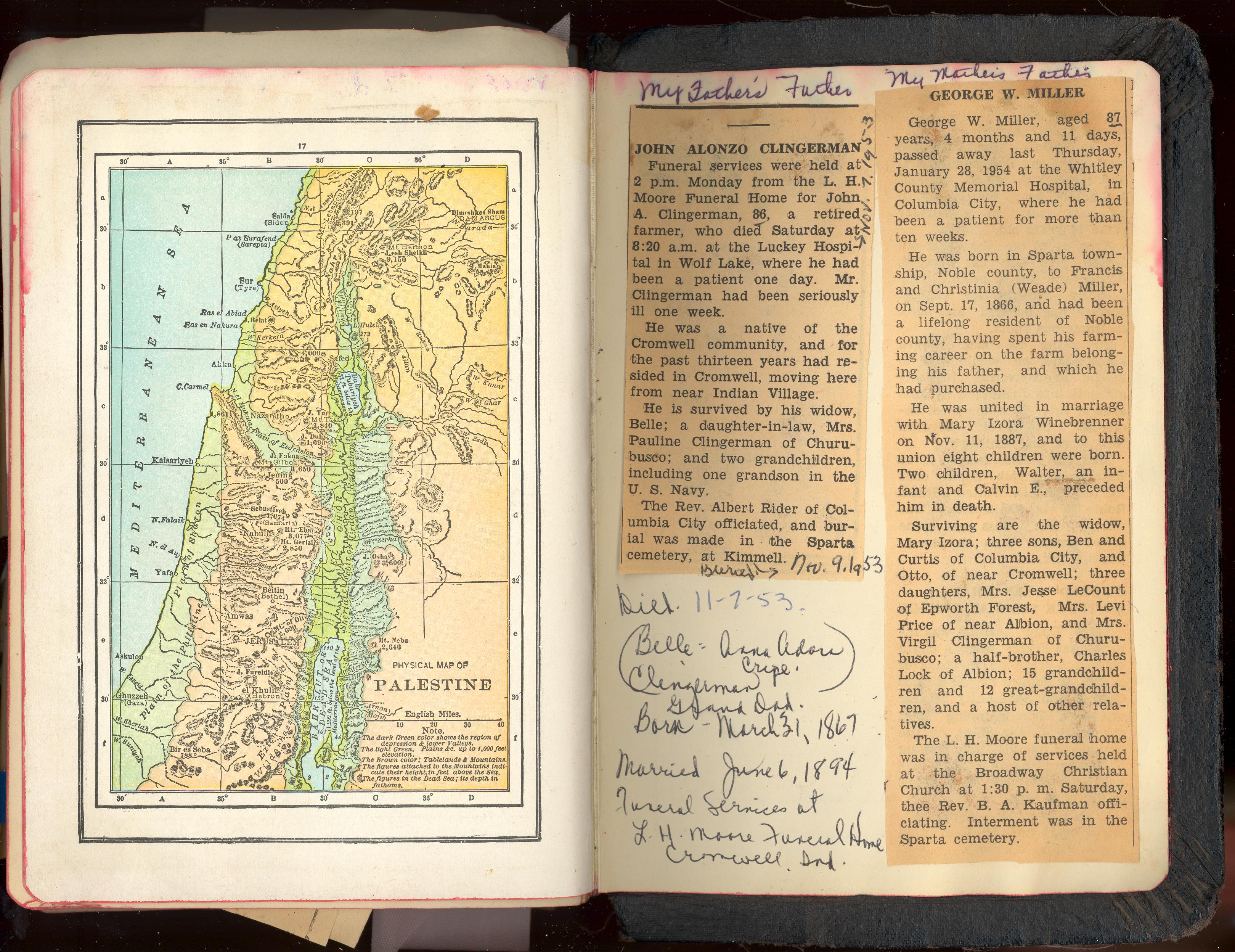 PicId: scan3064 Group: Misc Where: Unspecified When: Unspecified Subject(s): Grandma Miller; Grandpa Clingerman Comments: Obituaries in Mom's Bilble: Grandma M--Died May 3, 1956-age 86 of coronary occlusion Also Grandpa C.--Died Nov. 1953 -age 86 of stroke--Both at Wolf Lake Hospital Also Grandma C's mother--Lidda Hammond Cripe--Died May 24, 1892--age-61 |